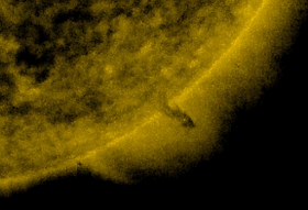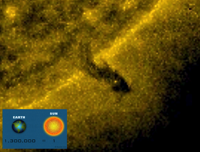 Um UFO maior que a terra, deixou ontem o Sol. Ele é preto, redondo e metálico e arrasta uma cauda, que faz parte do seu material. O UFO tem 1,5 o tamanho da terra, e pelo fato de ter entrado dentro do sol, deve ser capaz de suportar o calor de até 27.000.000 graus Fahrenheit. Isso é 15.000.000 graus Celsius. É uma espécie alienígena, que em milhões de anos, poderia facilmente ser capaz de ter uma a tecnologia, para suportar situações desse tipo.
